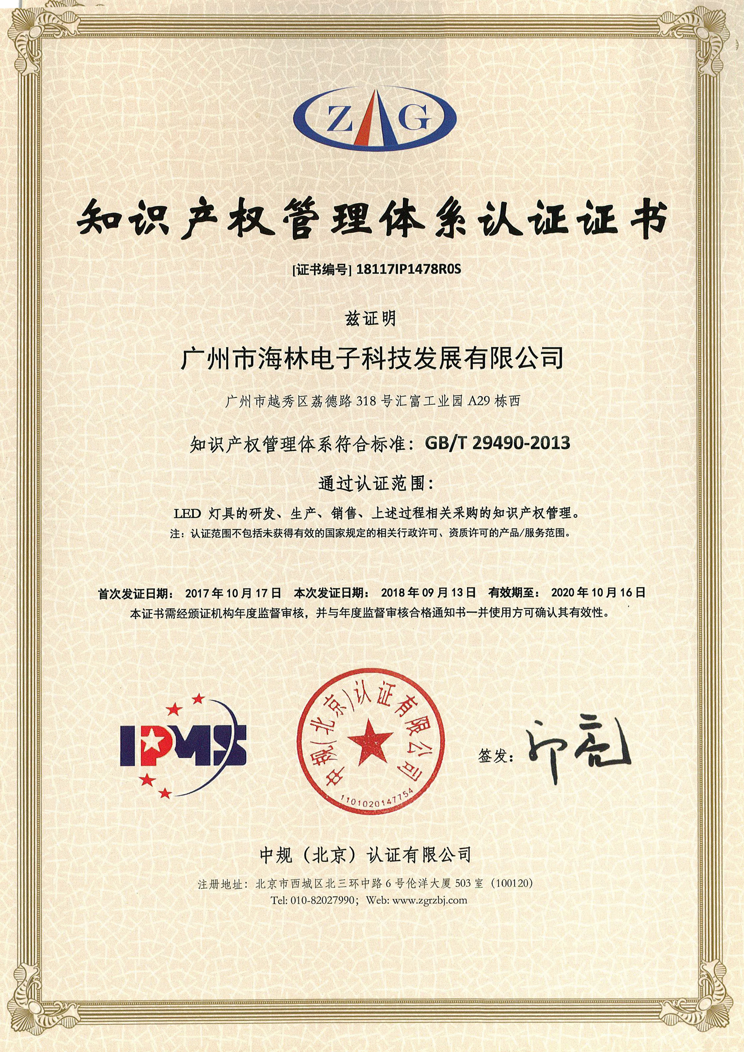 知識產(chǎn)權(quán)管理體系認證證書