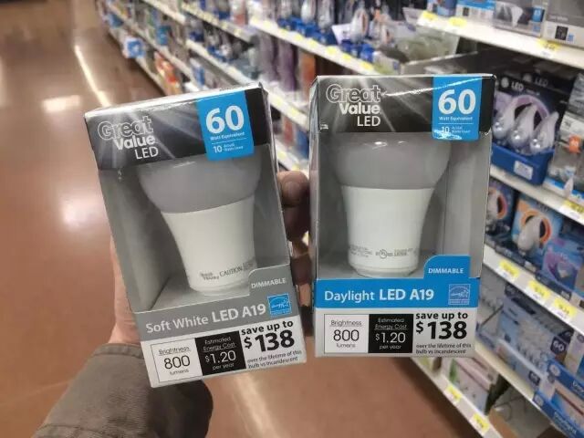 其中一個物美價廉的選項就是沃爾瑪貨架上銷售的可調(diào)光等效60W LED燈泡,品牌為“Great Value”、售價僅為4.88美元。該價位又具有可調(diào)光功能,是其另一大賣點,如飛利浦等效60W LED和GE Bright Stik LED雖然也為低價選項,但不可調(diào)光。而且,沃爾瑪?shù)倪@款LED也明顯比那兩個亮,并承諾更長使用壽命,為25000小時。
