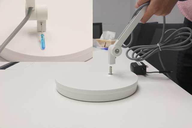 WiT的安裝十分簡單,直接將主體底部套在底座的金屬柱上,用螺絲刀固定住即可。