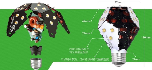 從外型上來看,這款綠諾LED燈泡的設計獨特,顛覆了傳統燈泡的外觀設計,有著較強的視覺沖擊力。該產品由11面印刷電路板拼合而成,總共有33枚LED燈珠,可以為家庭及商業(yè)用戶提供360度的照明體驗。