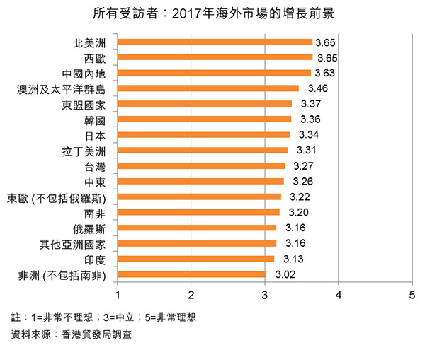 至于個(gè)別市場(chǎng)的增長(zhǎng)前景,北美洲及西歐兩大傳統(tǒng)市場(chǎng)被視為2017年最具增長(zhǎng)潛力的市場(chǎng),兩者均獲得3.65分,亦較中國(guó)內(nèi)地的3.63分為高。緊隨其后的是澳洲及太平洋群島、東盟國(guó)家、韓國(guó)、日本和拉丁美洲。事實(shí)上,所有市場(chǎng)的得分都在中立水平的3分以上(評(píng)分由1至5),反映業(yè)界普遍對(duì)全球市場(chǎng)感到樂(lè)觀。