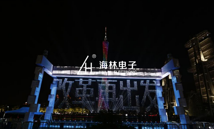 開幕式上無人機(jī)空中表演,并在夜幕中組成數(shù)字“40”等圖案。寓意著主題:改革開放40年,光語花城新時(shí)代。